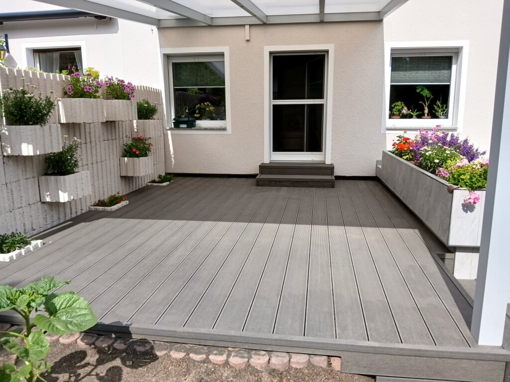Darüber hinaus entschloss sich unser Kunde dafür, die Zusammenarbeit fortzusetzen und beauftragte uns mit dem Bauprojekt eines Terrassensubstrats (WPC-System). Diese Ergänzung der Überdachung sorgt für einen einheitlich aussehenden und polyfunktionalen Außenbereich.