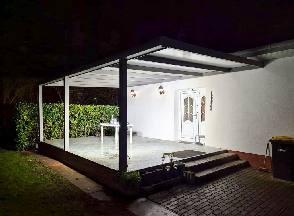 In Brieselang haben wir ein stilvolles und funktionales Terrassendach realisiert, das den Eingangsbereich optimal schützt und optisch aufwertet. Die Konstruktion erstreckt sich über großzügige 7×4 Meter und ist direkt an der Fassade des Hauses montiert. Als Dacheindeckung haben die Kunden opales Polycarbonat gewählt, das für eine angenehme Lichtdurchlässigkeit sorgt, gleichzeitig aber vor direkter Sonneneinstrahlung und Witterungseinflüssen schützt. Das Projekt Terrassenüberdachung Brieselang zeigt, wie durchdachtes Design und hochwertige Materialien Komfort und Ästhetik perfekt vereinen können.