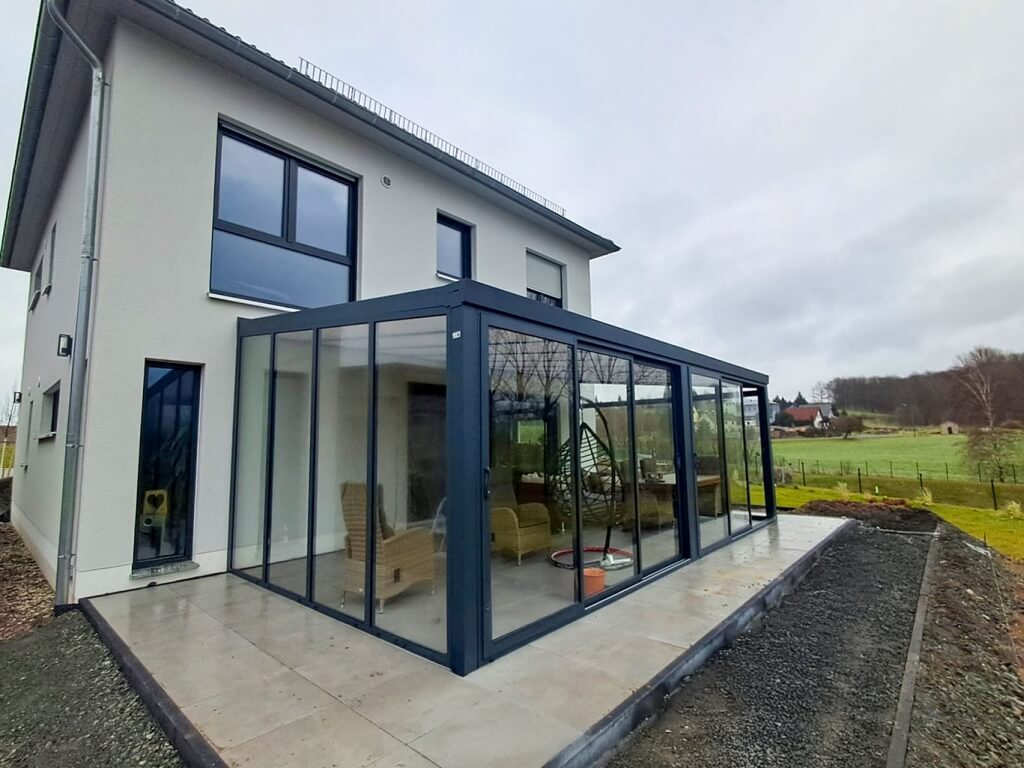 Ein entscheidender Faktor für den Komfort eines Wintergartens sind die verschiedenen Verglasungssysteme. Das rahmenlose Schiebesystem ermöglicht eine flexible Öffnung der Terrasse. An warmen Tagen kann der gesamte Bereich geöffnet werden, sodass ein fließender Übergang zwischen Innen- und Außenbereich entsteht. Der Wintergarten lässt sich also im Sommer ganz schnell in eine klassische Terrassenüberdachung verwandeln. Genießen Sie einen gemütlichen Ort, an dem Sie 365 Tage im Jahr verbringen können.