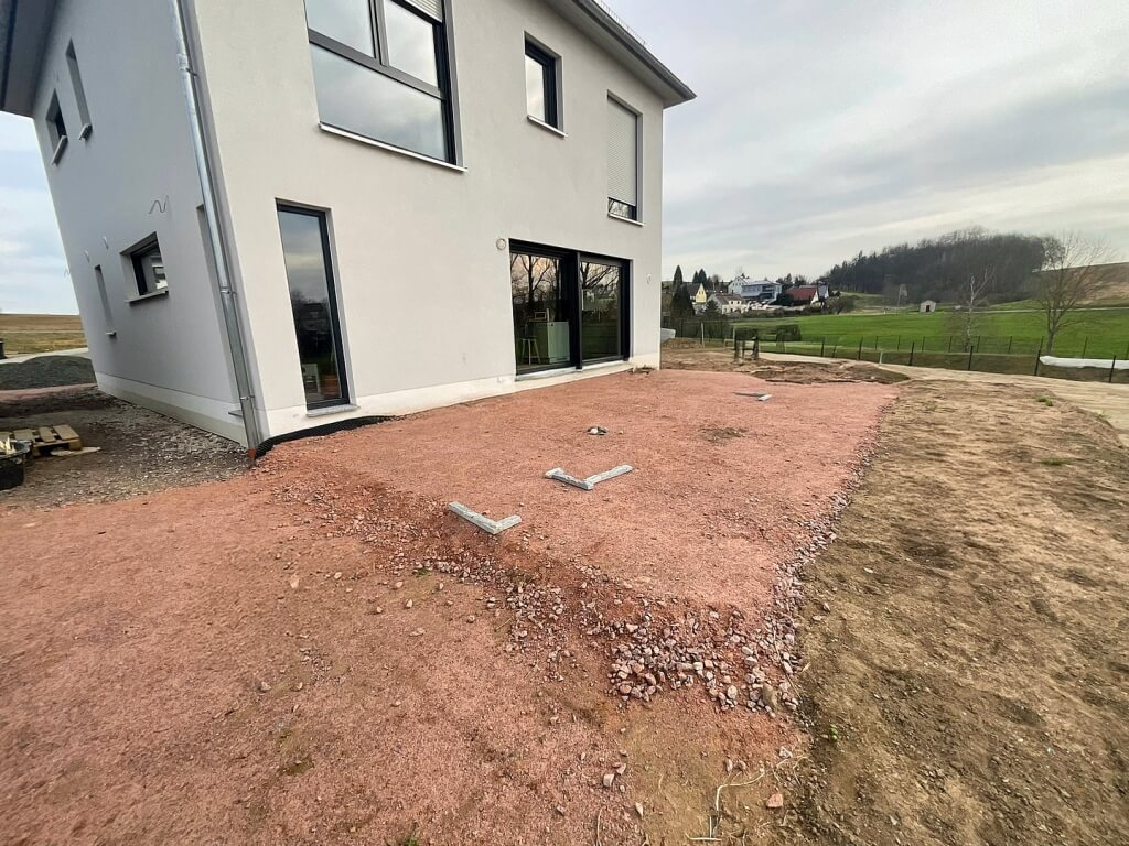 Die Basis jeder Terrassenüberdachung ist ein stabiles Fundament. Je nach Untergrund werden Punktfundamente oder eine durchgehende Betonplatte genutzt. In Nossen entschied sich unser Kunde für Betonplatten.