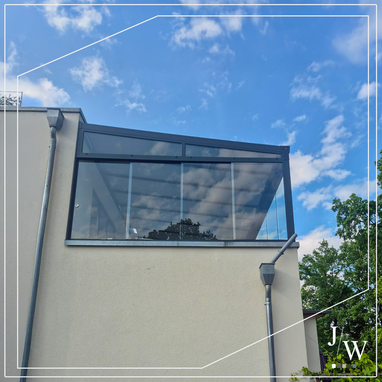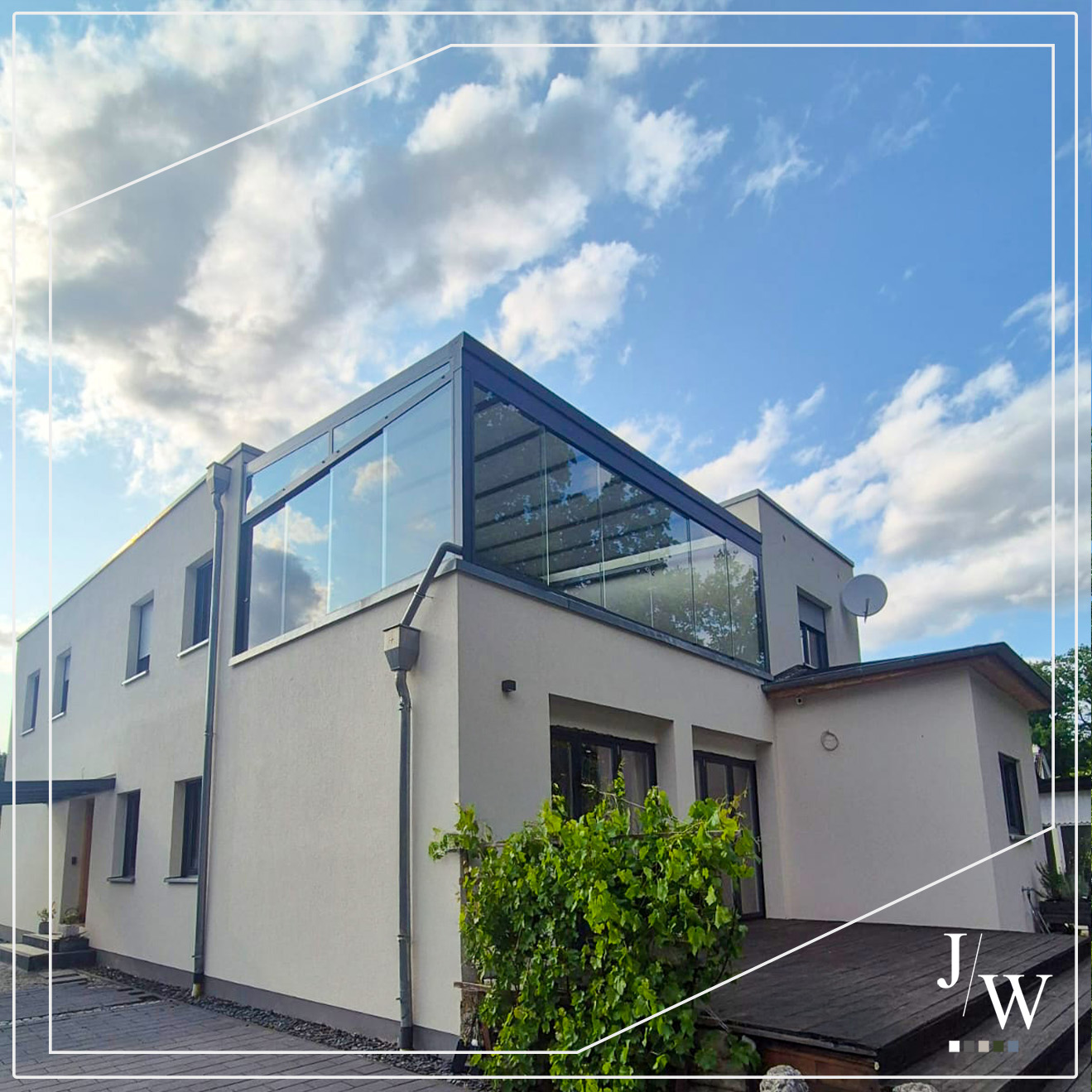Das Dach des Wintergartens besteht aus klarem VSG-Sicherheitsglas. Es sorgt für Schutz und optimale Lichtdurchlässigkeit. Die anthrazitfarbenen Aluminiumprofile verleihen der Konstruktion ein modernes und elegantes Aussehen, das perfekt zur Fassade passt.