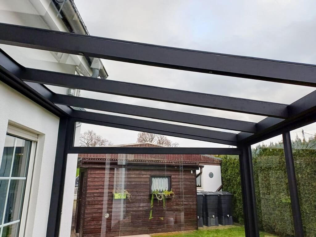 Für die Verglasung haben wir spezielle UV-beständige Scheiben verwendet. Diese reduzieren die Belastung durch direkte Sonneneinstrahlung, schützen vor Überhitzung und beugen dem Ausbleichen von Möbeln vor. - Die Frontseite des Wintergartens ist mit einer festen Glaswand ausgestattet, die eine zusätzliche Stabilität bietet und den Raum vor äußeren Einflüssen wie starkem Wind oder Regen schützt.